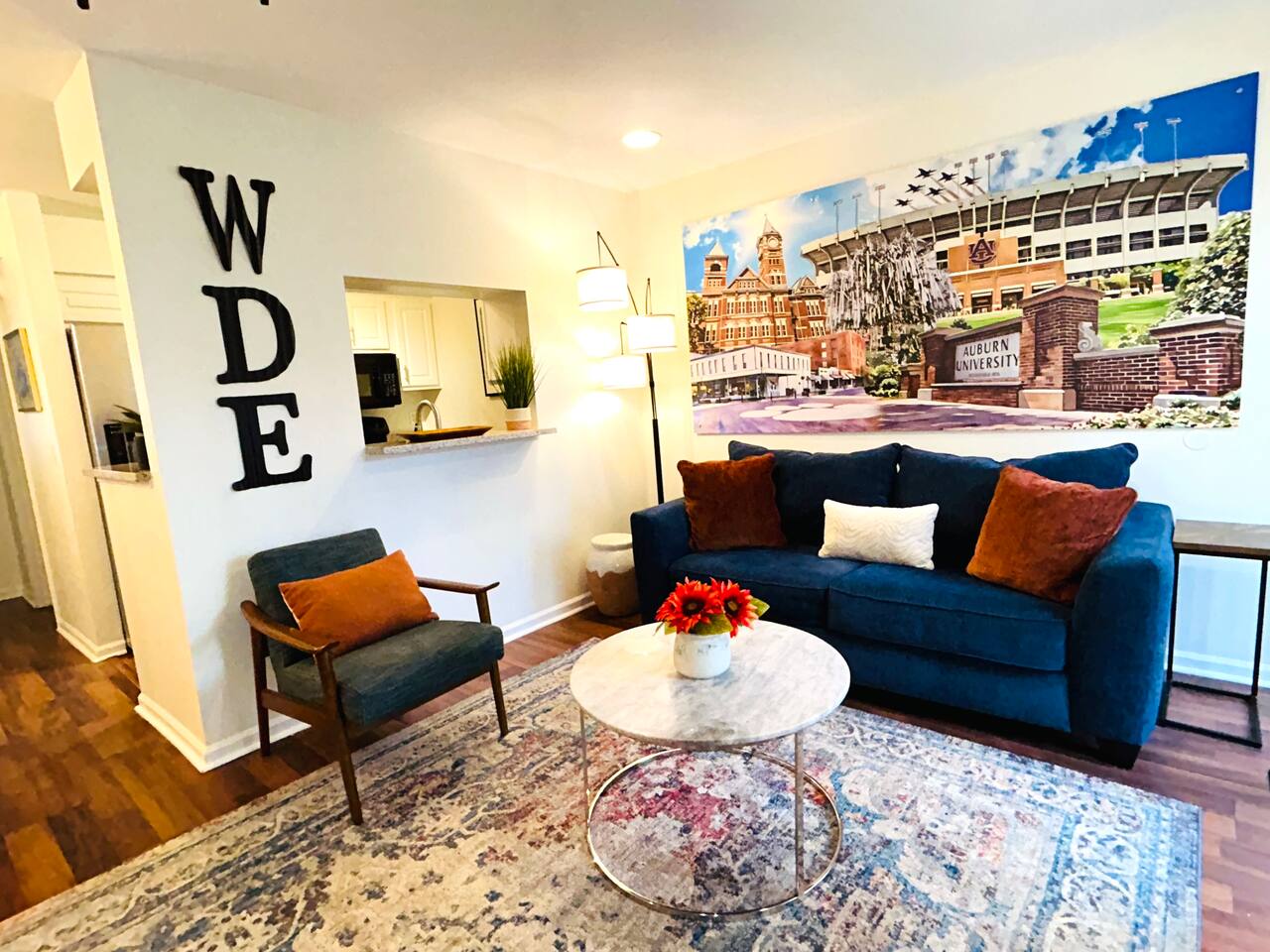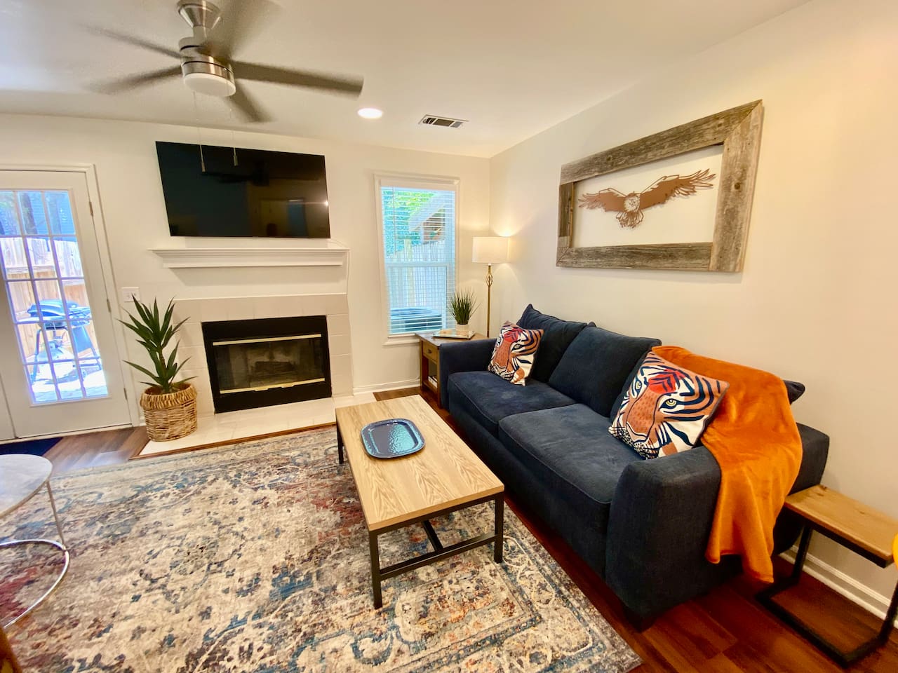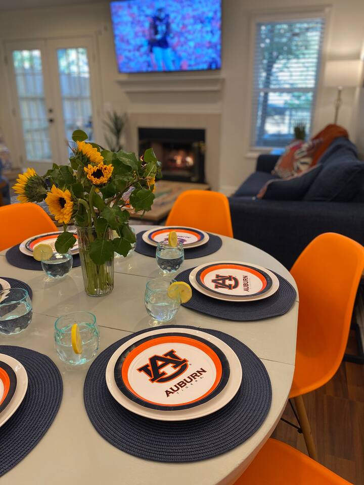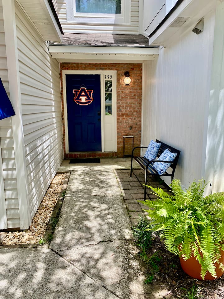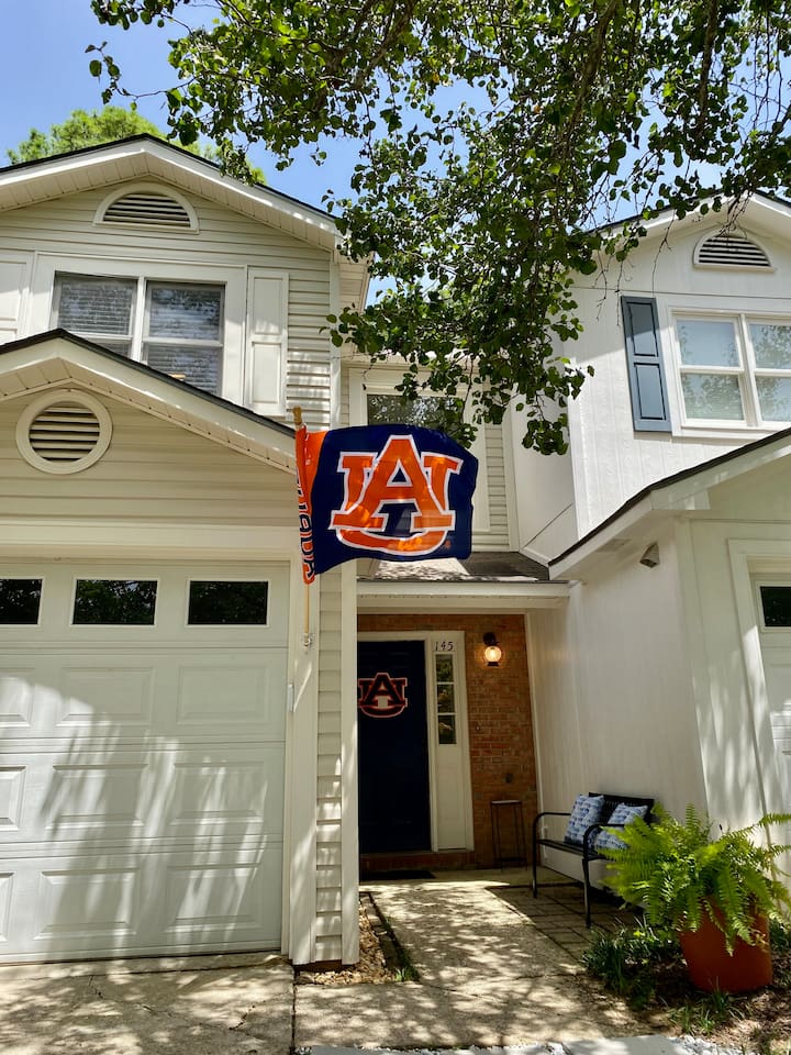 "Your place is absolutely awesome! Stayed in a bunch over the years and this one is now at the TOP of the list." -- Adam, March '25 Welcome to JET'S HANGAR- AU! We are Auburn parents who love to share our spacious, pet-friendly home away from home with you! Come home to the Plains. Jet's Hangar AU is 1300 sq ft that is perfect for families or small friend groups. Our getaway has 2 bedrooms, 2.5 baths, and a new sleeper sofa to host up to 8 people total. Location is key and guests can WALK to both Auburn University campus and the fun restaurants, bars, and shopping downtown. Our fenced backyard is perfect for grilling out, tailgating, or letting your family dog run. "The Hangar" makes life easy with your own driveway parking for 2, a washer and dryer, and a fully stocked kitchen. We try to provide for your every need, so you can just enjoy your college kids and all that the town of Auburn has to offer! THE SPACE *Arriving* The first thing you will see inside our 2 story entryway is your welcome book full of local info regarding restaurants, coffee shops and Auburn must-sees, a guest book to sign, original Auburn art, and access to our private 1 car garage. Also on the first floor is a half bath and full sized washer and dryer with detergent provided in case you'd like to do your student's laundry! *Eating* The fully renovated kitchen has stainless steel appliances, granite countertops, new sink, new lighting, and coffee (K cup and pot brewed) provided. All cooking utensils, pots, pans, and dishes are stocked in case you want to make a home-cooked meal for your student. We also provide wine glasses and kid-friendly plastic cups and dishes. The dining table seats 6 comfortably, and is adjacent to the living room with more seating. - Fully stocked kitchen - Keurig/ Coffee maker - Fridge in-door water dispenser - Crock pot - Blender - 6 top dining table *Lounging* Our open floor plan allows you to chat with anyone downstairs and the kitchen, living, and dining area are all connected. Kick back on our brand new couches and watch the game on the 53" TV. In the winter, cozy up with a fire in the fireplace with logs provided for you. The rest of the year, open up the double french doors to the shaded back porch and enjoy indoor/outdoor living! - 53" TV - Wood burning fireplace - Cozy AU blankets - Queen sleeper sofa - Auburn puzzles, playing cards, & books - Brand new furnishings 2024 *Sleeping* Both of our bedrooms are upstairs and each has its OWN full bath (1 attached to primary and 1 in the hall). The huge primary bedroom is 12 x 18 with a comfy King bed, dresser, and work desk area. Of course high speed internet, desk lighting, and spare plugs are positioned to make any work that must be done while on vacation as quick and painless as possible. You can store as many things as you need in the large walk-in closet complete with luggage rack and coat hangars. Stored in the closet is also a queen blow up mattress and bedding in case you have extra guests. Primary full bath is attached with 2 sinks and large mirrors to get ready for the big game. The second bedroom has a queen bed, plenty of pillows, and a closet with an extra tabletop fan. New blinds hang in both bedrooms, as do new ceiling fans. - All new furnishings, bedding - Ceiling fans - Extra tabletop fans - Extra blankets and pillows - 1 King bed, 1 Queen bed, and 1 Queen blow up mattress - Walk in closet with hangars and storage - Work space desk, lighting, wifi, plugs - Room darkening curtains - Smart TV in each bedroom *Necessities* The 2.5 baths each have new sinks and countertops (2024). Half bath is downstairs and both full baths are up. Plush white bath towels, hand towels, and even make-up cloths are provided. Each bath has hand soap, bath soap, shampoo, and conditioner. Make-up mirrors and hair dryers are stored also so a house full of girls can get ready at once. *Tailgating* Throw open the double french doors and enjoy our fenced back yard and patio. The outdoor dining table seats 6, with other lounge chairs provided. Grill a meal under the tree canopy and string lights and enjoy just being together. Jet's Hangar is uniquely close to campus and still quiet and peaceful outside. Bring your kid's pup from home, play the oversized outdoor games there, and celebrate all that is Auburn! *Exploring* Location! Location! Location! THIS is why we bought this townhouse! Jet's Hangar is close to everything Auburn! We WALK to everything on campus and downtown. - A Game Day weekend... Jordan-Hare Stadium... 1.5 mi Neville Arena... 1.6 mi Toomers Corner to celebrate the win.... .7 mi Quad Center for student tours because now you want to become an Auburn Tiger.... 1.2 mi And FREE parking to all these events because your car is at Jet's Hangar. No game day traffic to deal with here. NEVER worry about the dreaded on-campus parking ticket. - Getting Here... Atlanta airport... 99 mi and an easy drive on I85 all the way - Entertainment Downtown... Sky Bar... .8 mi famous Toomers Lemonade and Drug Store... .7 mi Hamiltons for dinner... .7 mi ALL the shopping... .7 mi Well Red Coffee and Bookstore... .3 mi - Other Entertainment... Tiger Town shopping in Opelika... 5.5 mi Historic Downtown Opelika... 8.3 mi Botanic Garden and Restaurant... 6.2 mi The Gogue Performing Arts Center featuring Broadway tours... 2.2 mi The Great Outdoors on the Plains... Lake Martin... 34 mi Robert Trent Jones Golf Trail and Grand National course... 7.9 mi Chewacla State Park, trails, and waterfall... 4.8 mi